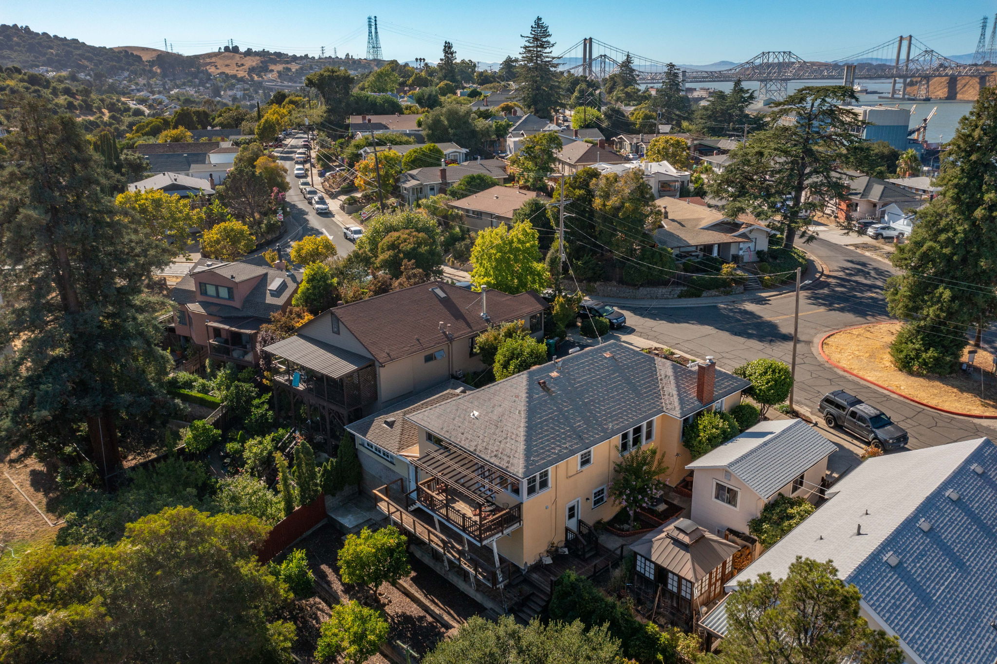2 Bed 1 Bath plus Office with plenty of natural light and views. Separate In-law unit with private entrance, deck, and garden patio area. Home features charming built-ins, original hardwood floors, Wedgewood stove and updated kitchen with granite counter tops and tons of storage. Beautiful panoramic views of the hills and peeks at the Carquinez Straights, mature fruit trees, brick garden boxes, large workshop area and garage with potential to expand living space. Short walking distance to town, parks, trails, swimming, tennis and a short drive to Bart, Oakland, San Francisco, or Sacramento. The home you have been waiting for!