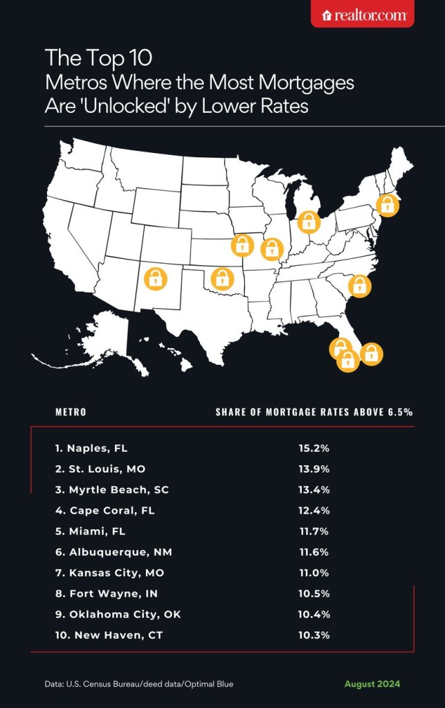 According to a new analysis from Realtor.com, certain metro areas could see early signs of increased market activity as rates continue to fall. These markets have a high percentage of recent home sales when rates were above 6.5%. Homeowners in these areas are now “unlocked” and in a better position to refinance or sell their homes as rates dip below this threshold.